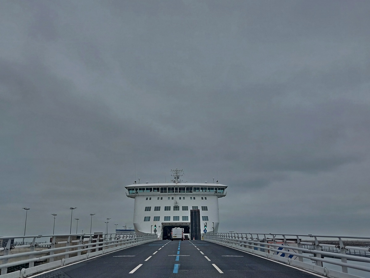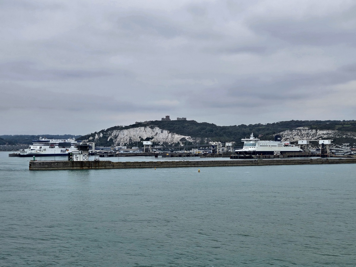 Na een rustige overtocht voeren we de haven van Dover binnen, waar de boot opnieuw moest keren, zodat we er vanaf de achterzijden vanaf zouden kunnen rijden.