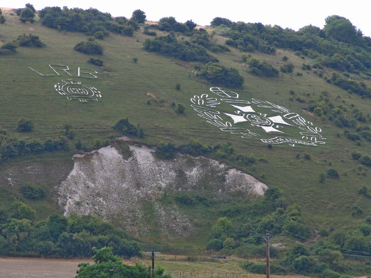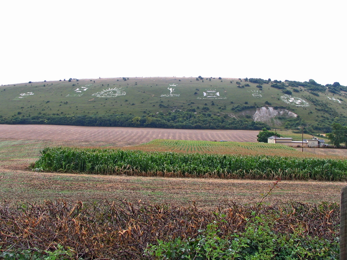 Het was droog, na wat regen in de nacht, maar wel koel en er was veel wind. In de auto had ik daar niet veel last van. Toen ik een eindje onderweg was, passeerde ik Fovant, waar in een heuvel enorme badges van legeronderdelen zijn aangebracht. Vanaf de weg kijk je vanaf een flinke afstand op die heuvel, waardoor je een mooi overzicht over al die tekens hebt.