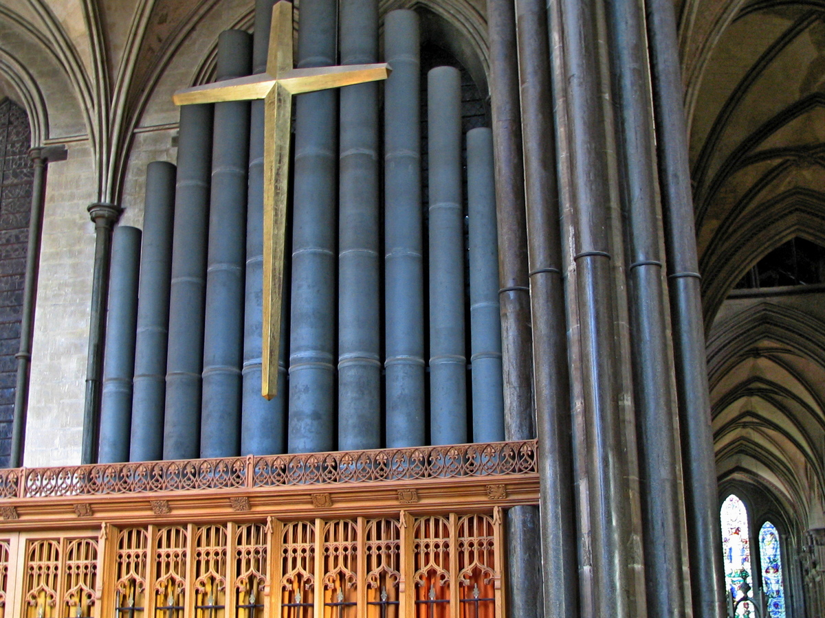 Het orgel bevindt zich in het koor, verdeeld over twee kassen, elk aan een zijde van het koor. De grootste pijpen staan (ver van het orgel) opgesteld in het noord-transept. Ik heb ze horen gebruiken tijdens de Evensong. Dergelijke lage tonen hebben geen richting, je merkt niet dat ze heel ergens anders vandaan komen dan de rest van het geluid. Ook hier zong een gastkoor de Evensong. Dit was een koor uit Engeland en leverde betere kwaliteit dan de Amerikanen in Chichester.